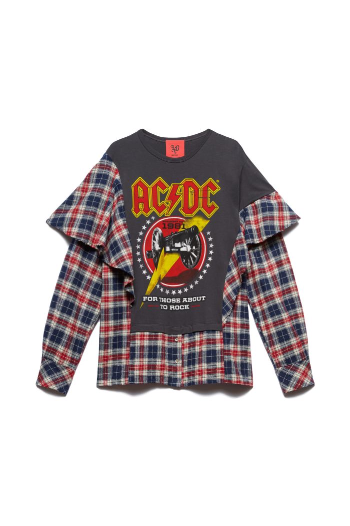 ROCK E GIRLISH IN UN COLPO SOLO. LA CAMICIA AC/DC REINTERPRETA L’ICONICO LAYERING IN UN PEZZO UNICO E FUORI DAGLI SCHEMI. IL DAVANTI È DOMINATO DA UNA STAMPA DEDICATA ALLA BAND EFFETTO T-SHIRT, CUCITA SULLA BASE CHECK DELLA CAMICIA CON MANICHE LUNGHE E ROUCHES APPLICATE. IL LETTERING ANIYE BY SUL RETRO SIGILLA L’IDENTITÀ DEL CAPO.