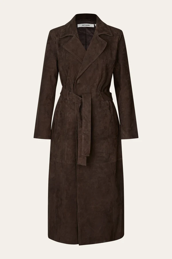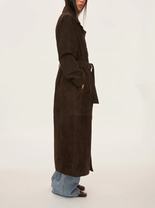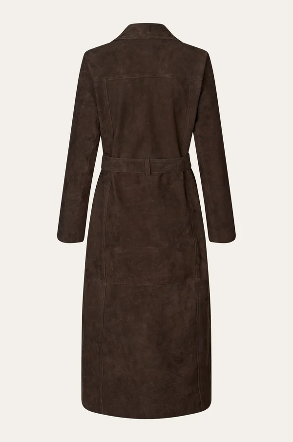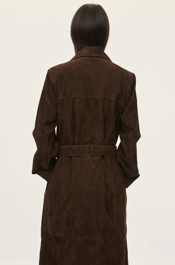 CAPPOTTO IN CAMOSCIO CON CINTURA. REALIZZATO IN MORBIDA E LISCIA PELLE SCAMOSCIATA CON CUCITURE TONO SU TONO. PRESENTA UN COLLO A REVERS, CHIUSURA FRONTALE CON BOTTONI AUTOMATICI NASCOSTI E CINTURA IN VITA. DUE TASCHE LATERALI NASCOSTE. COMPLETAMENTE FODERATO. VESTIBILITÀ SLIM E DRITTA.
